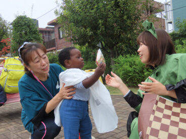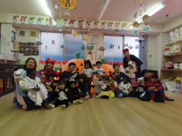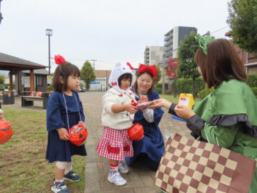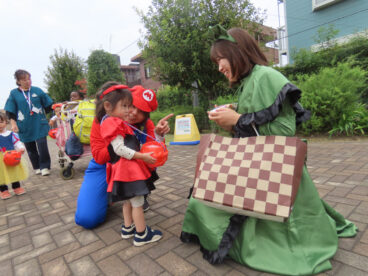 ハロウィンパーティーをしました。10月に入ってハロウィンに向けた絵本を読むことが増え、みんなで「トリックオアトリート〜!」と元気に言えるまでになりました。
